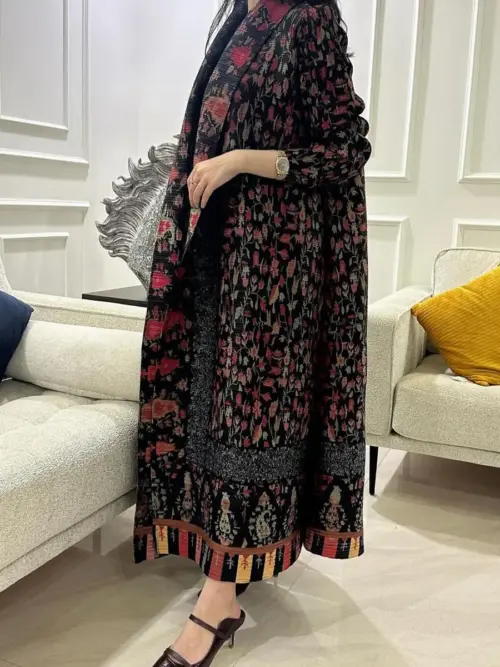 Timeless full-length open abaya in elegant classic black featuring a clean structured silhouette for a refined minimal look.