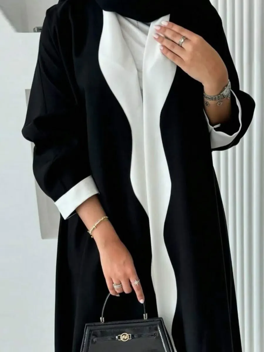 Elegant black open abaya with bold ivory front panel and matching cuff accents for a timeless sophisticated look
