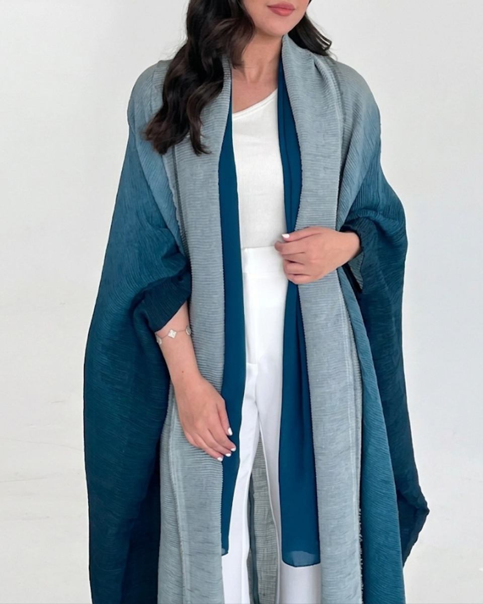 Soft flowing two-tone abaya in deep teal with elegant lightweight drape.