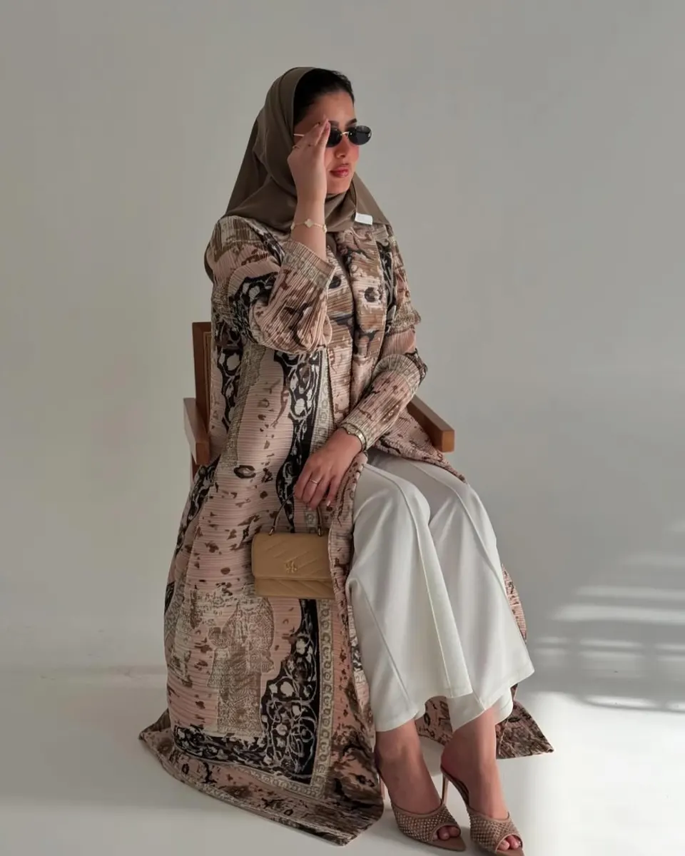 Elegant open abaya in warm desert beige tones featuring vintage-inspired artistic prints and a flowing silhouette for a refined modern look.