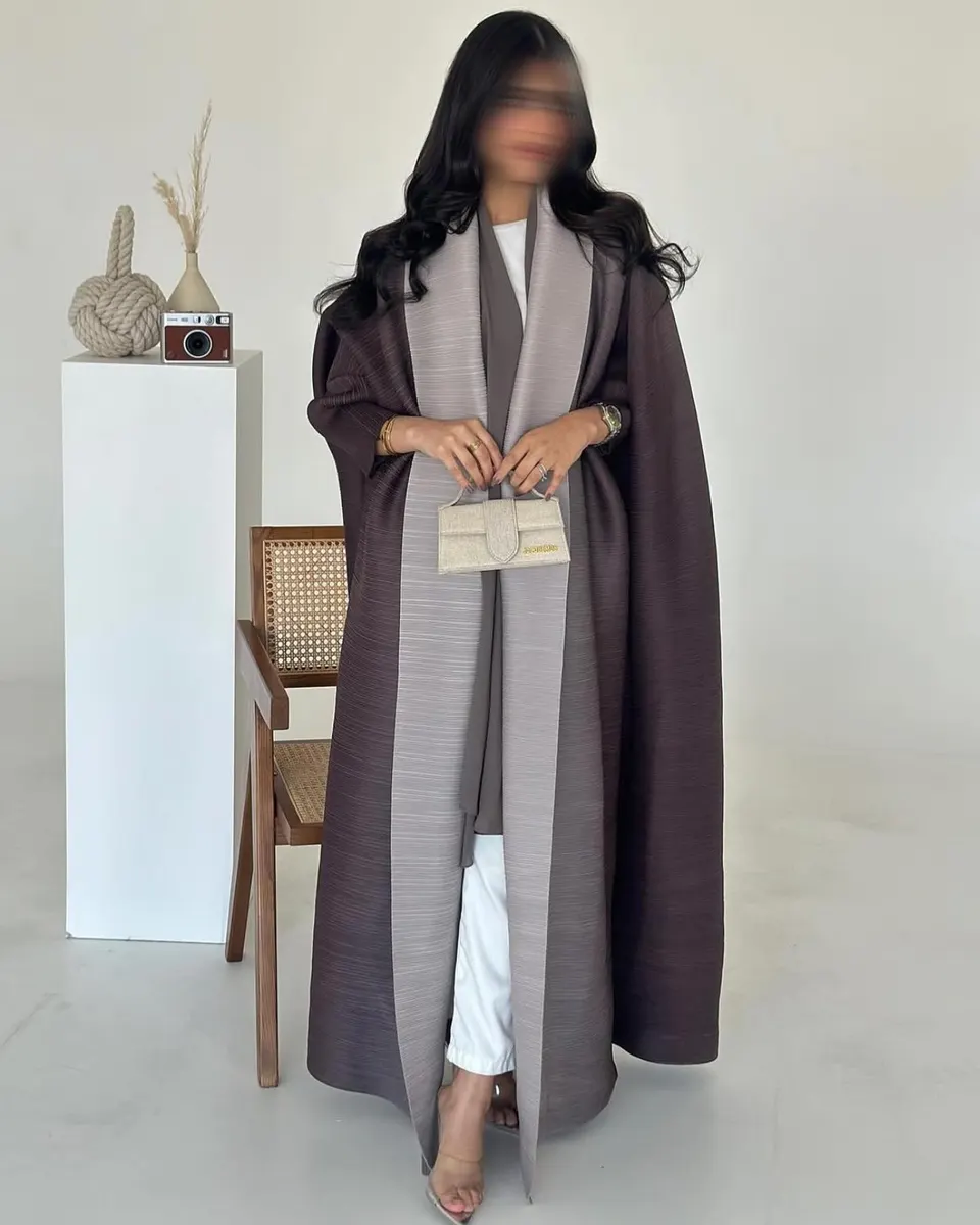 Elegant dual-tone cocoa and taupe pleated abaya with soft flowing layers and contemporary chic finish.