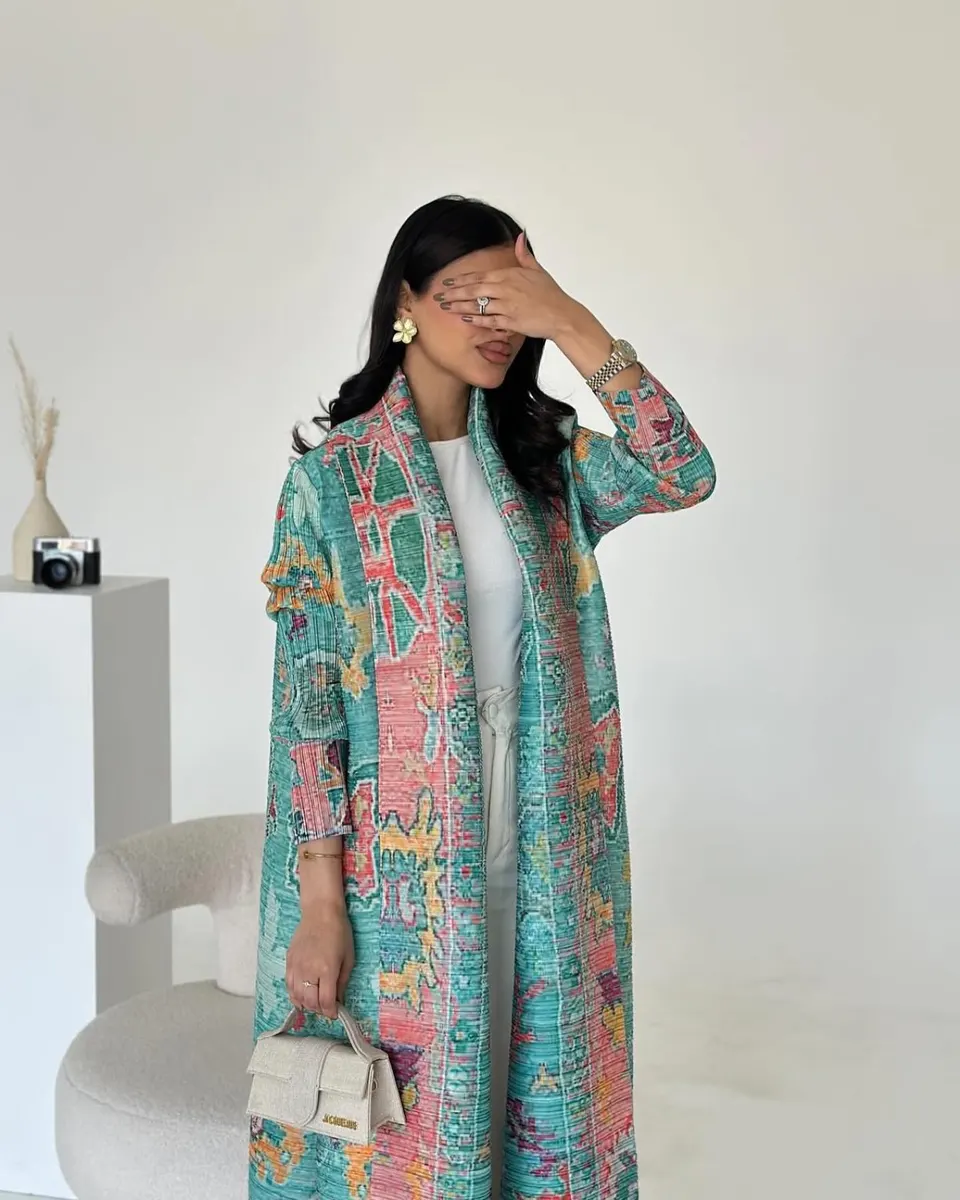 Vibrant open abaya in rich emerald green with artistic mosaic-inspired patterns in coral and gold tones for a fresh elegant statement look.
