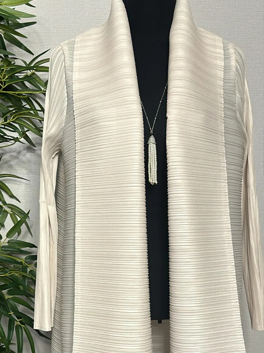 Soft ivory pleated abaya with elegant flowing texture and timeless refined look.