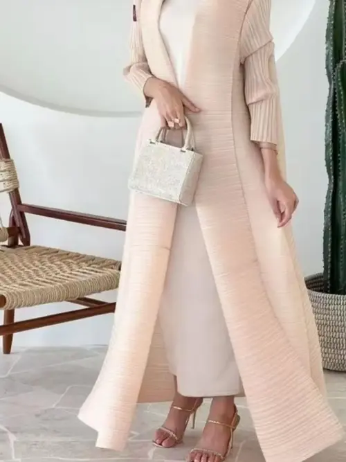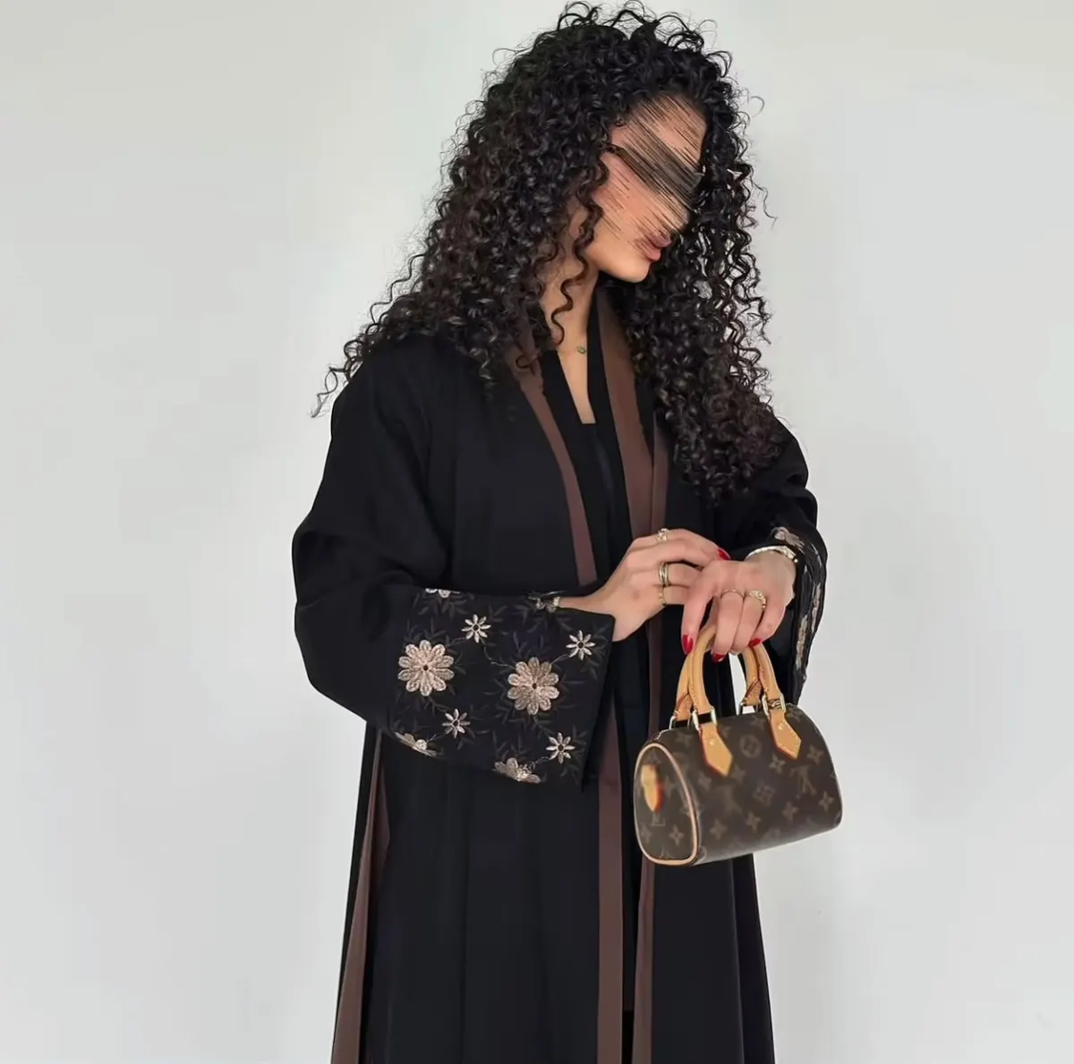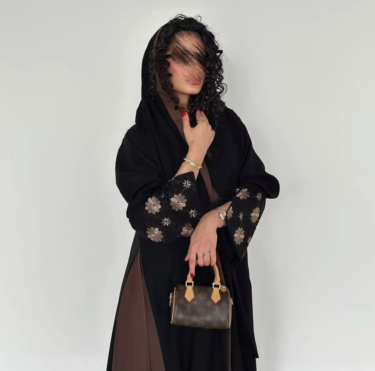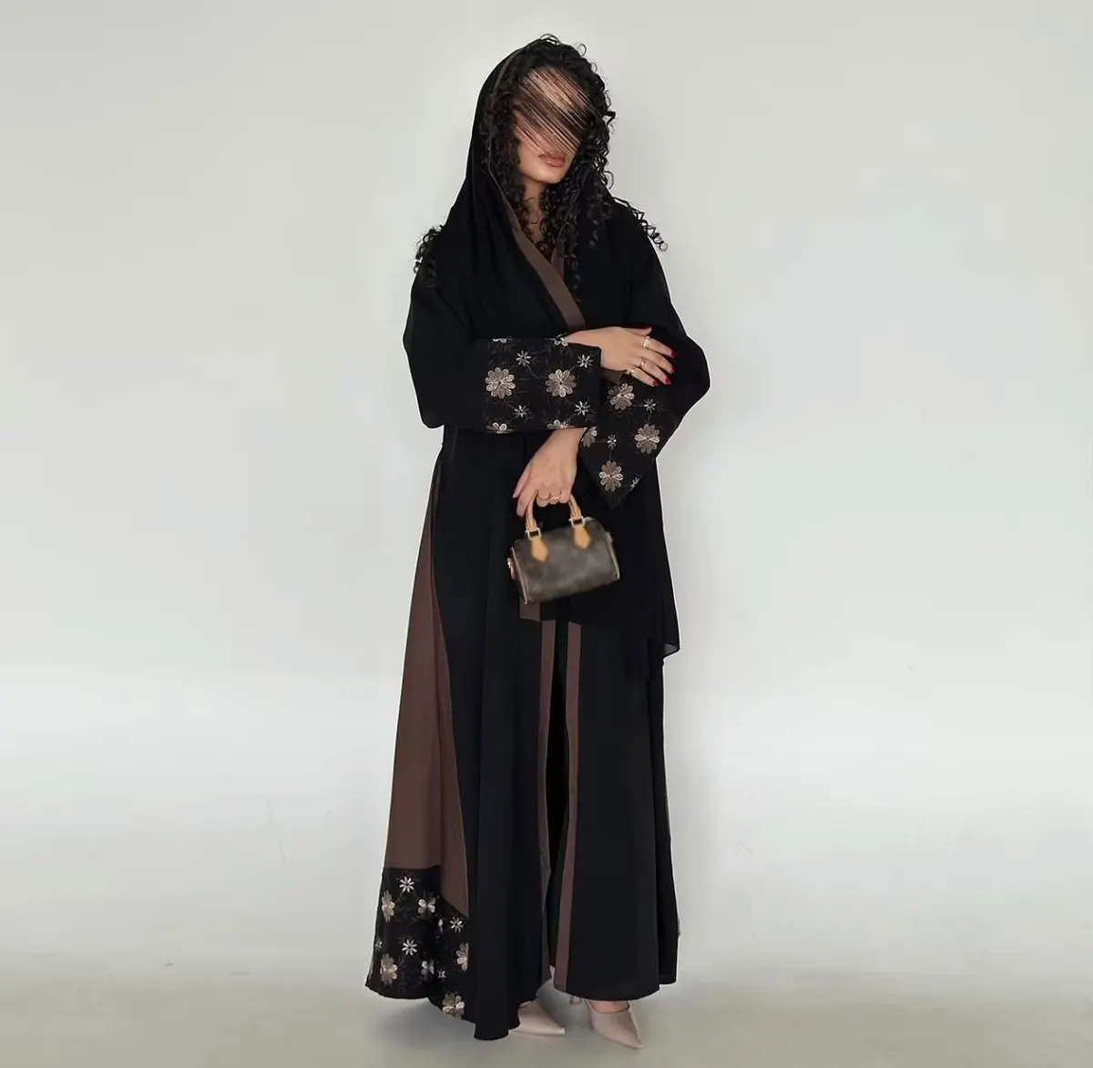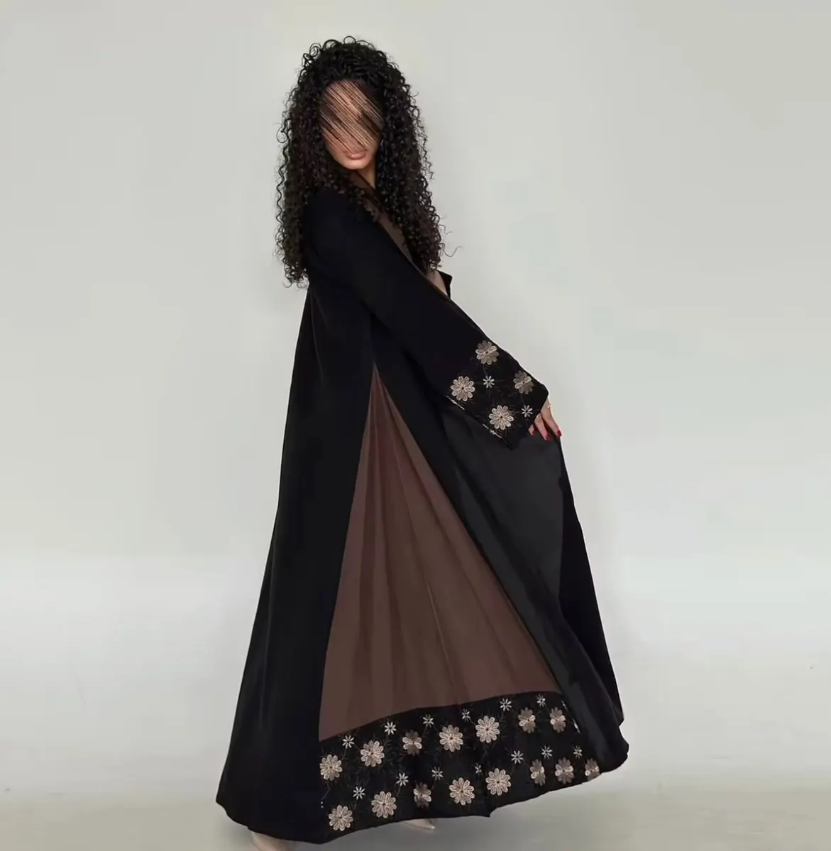 Elegant black open abaya with mocha side panel and delicate floral embroidered cuffs and hem for a refined feminine silhouette