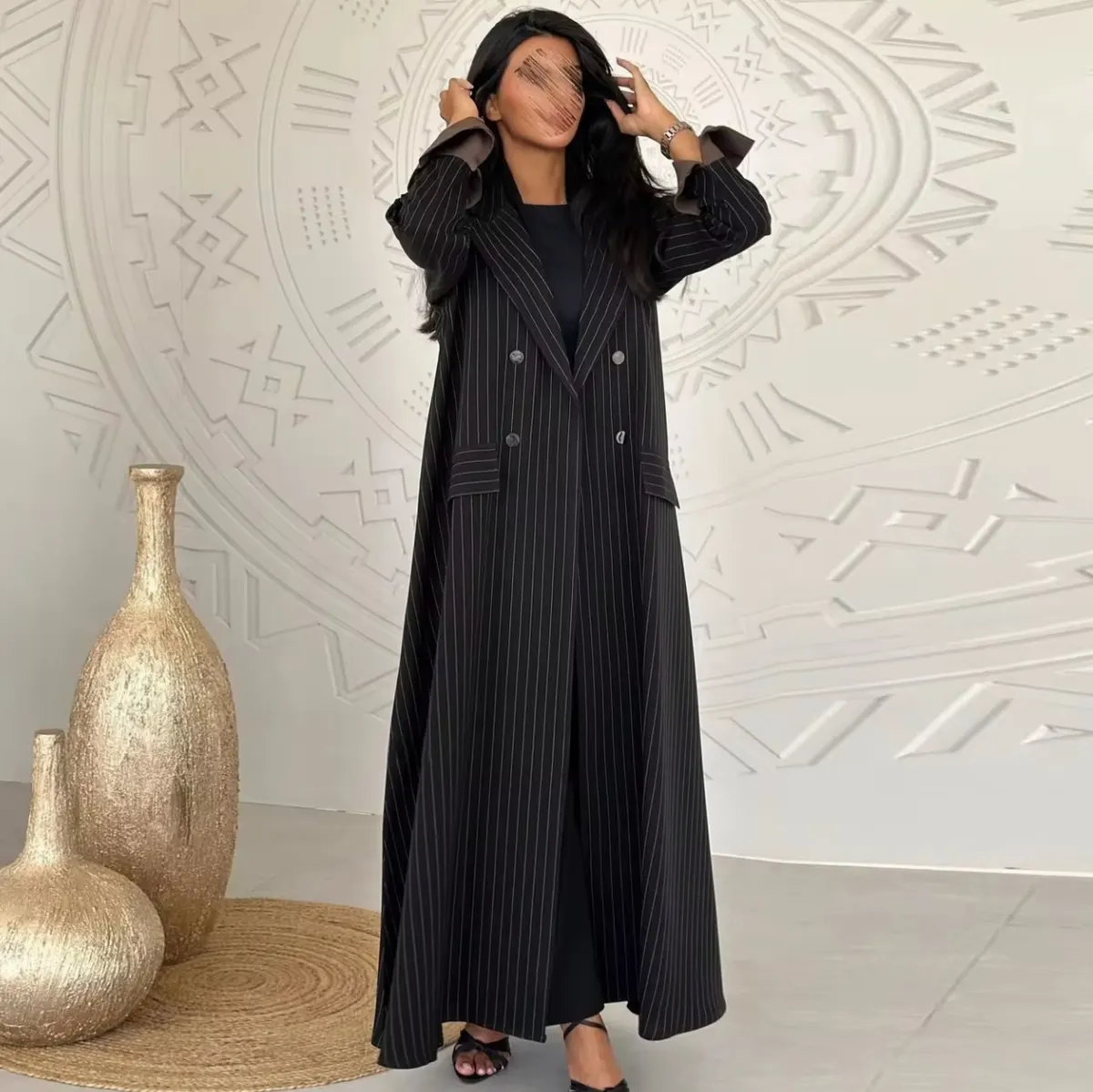 Elegant black pinstripe abaya with structured lapel collar, double-breasted buttons, and contrast cuff detailing for a modern refined look