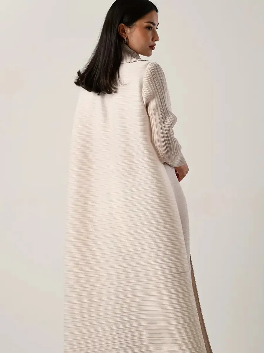 Chic ivory pleated abaya with a clean flowing silhouette and refined textured finish, perfect for an elegant minimalist look.