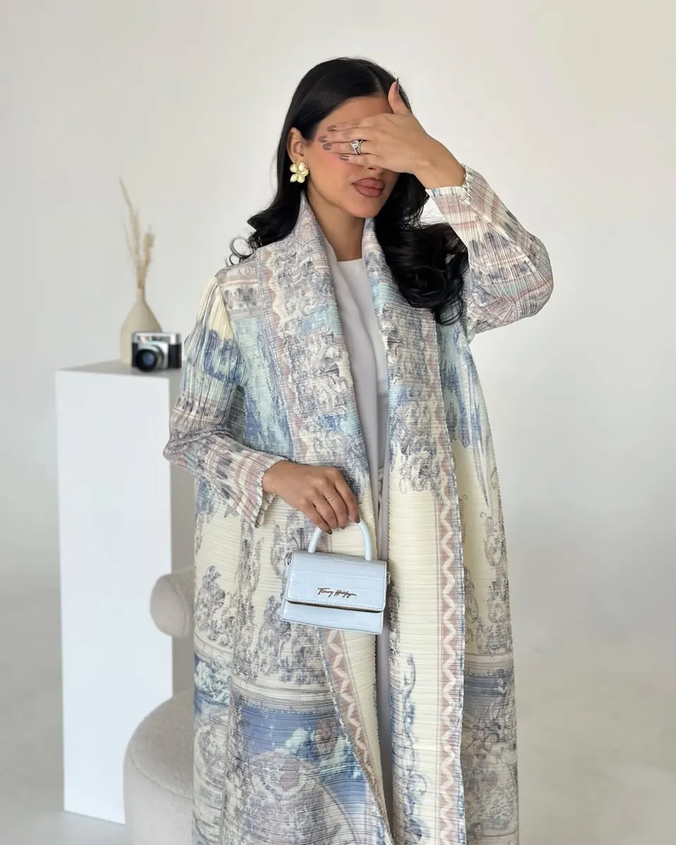 Elegant open abaya in soft pastel tones with vintage tapestry-inspired detailing in blue, blush, and beige for a refined feminine look.